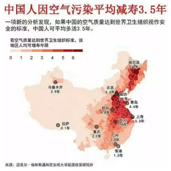 芝加哥大學(xué)能源政策研究所一份最新分析報(bào)告稱,空氣污染讓中國人預(yù)期壽命縮短了3.5歲;其中北京居民平均減壽6.4年,上海為5.5年,廣州為2.8年,拉薩為0.1年,哈爾濱等東北重工業(yè)城市,居民平均壽命最高可縮短6.9年。